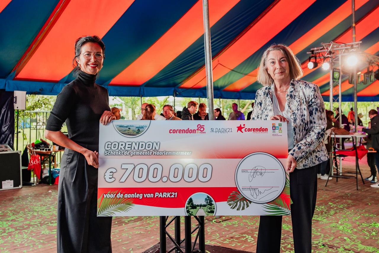 Tijdens de PARK21 Zomerweek overhandigde de CEO van Corendon, Gunay Uslu, officieel de donatie van 700.000 euro aan wethouder Mariette Sedee van de gemeente Haarlemmermeer. Een cadeau aan de regio waar Corendon al 25 jaar trots actief is. De bijdrage gaat naar de ontwikkeling van het deelgebied Groot Vennep in PARK21.